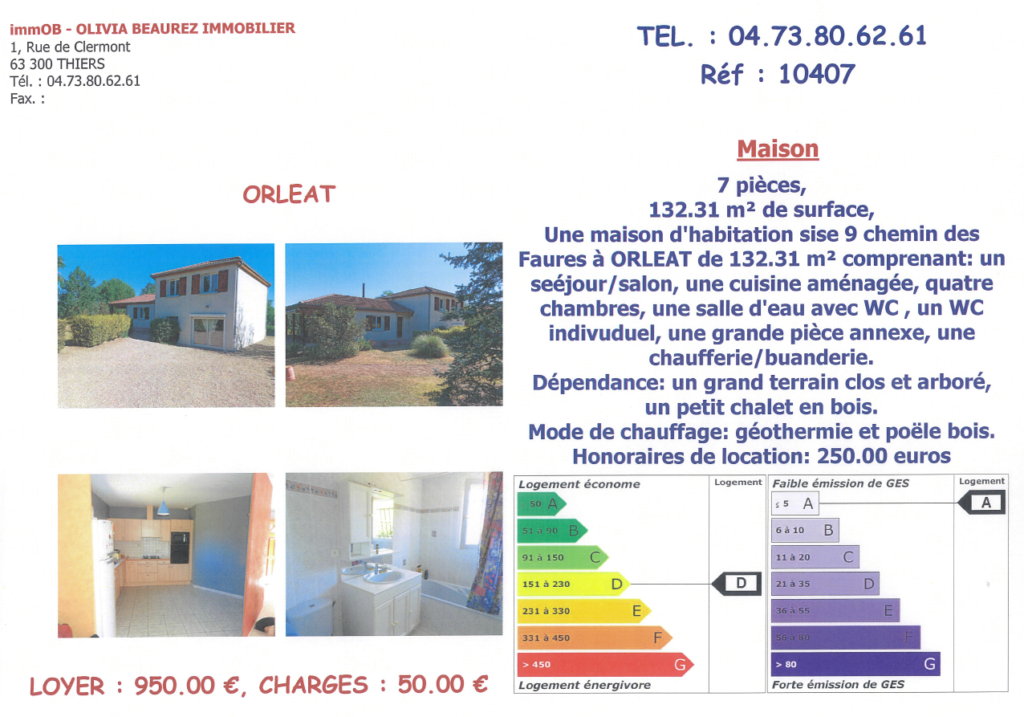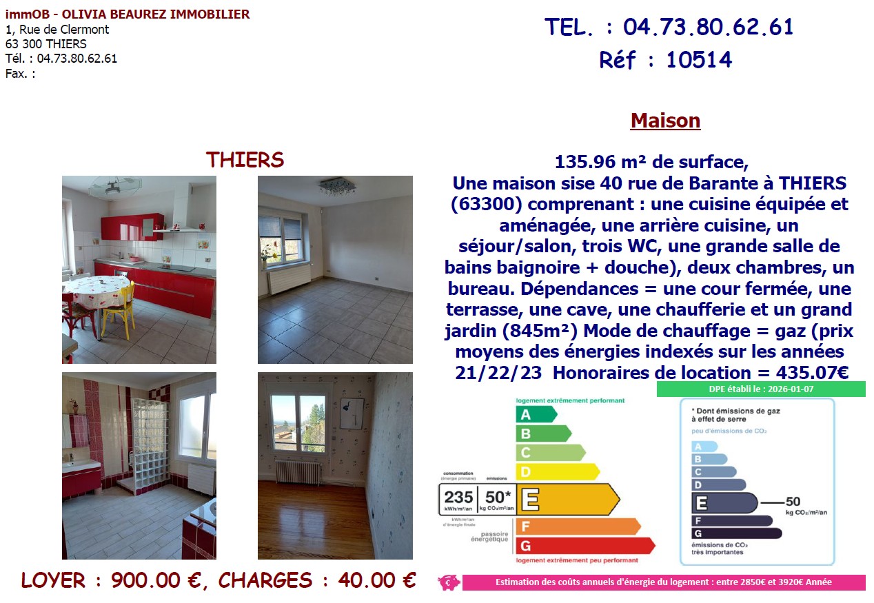 🏠THIERS – rue de Barante – MAISON – 135m² – 940€ CC