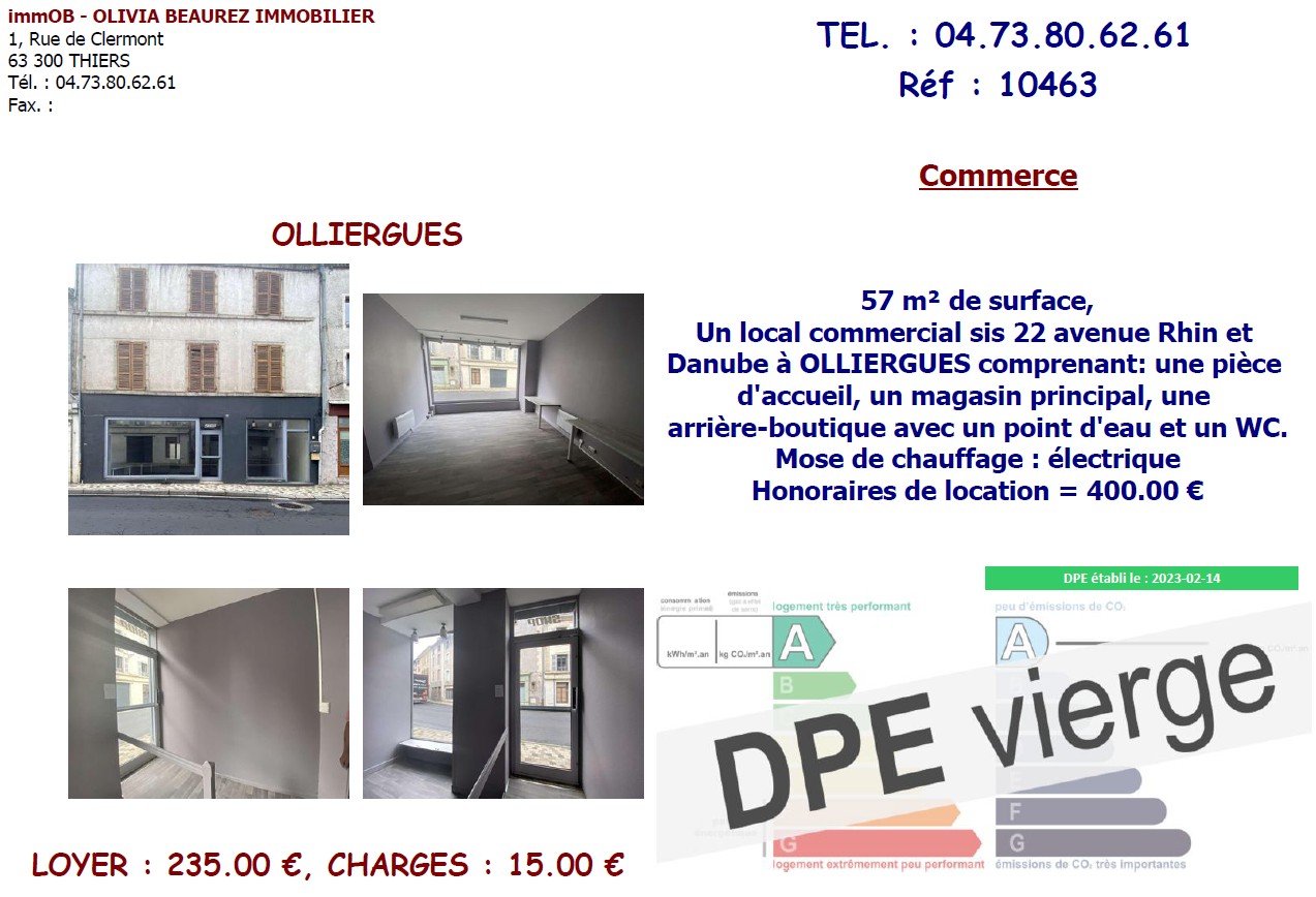 🏢 OLLIERGUES – avenue Rhin et Danube – LOCAL COMMERCIAL – 57 m² – 250 € CC