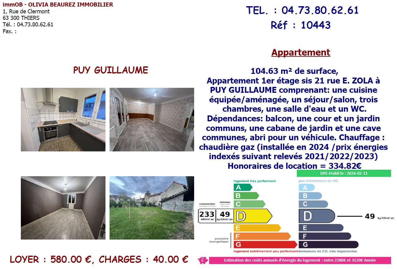 🏢 PUY-GUILLAUME – rue Emile Zola – APPARTEMENT – 104 m² – 620€ CC