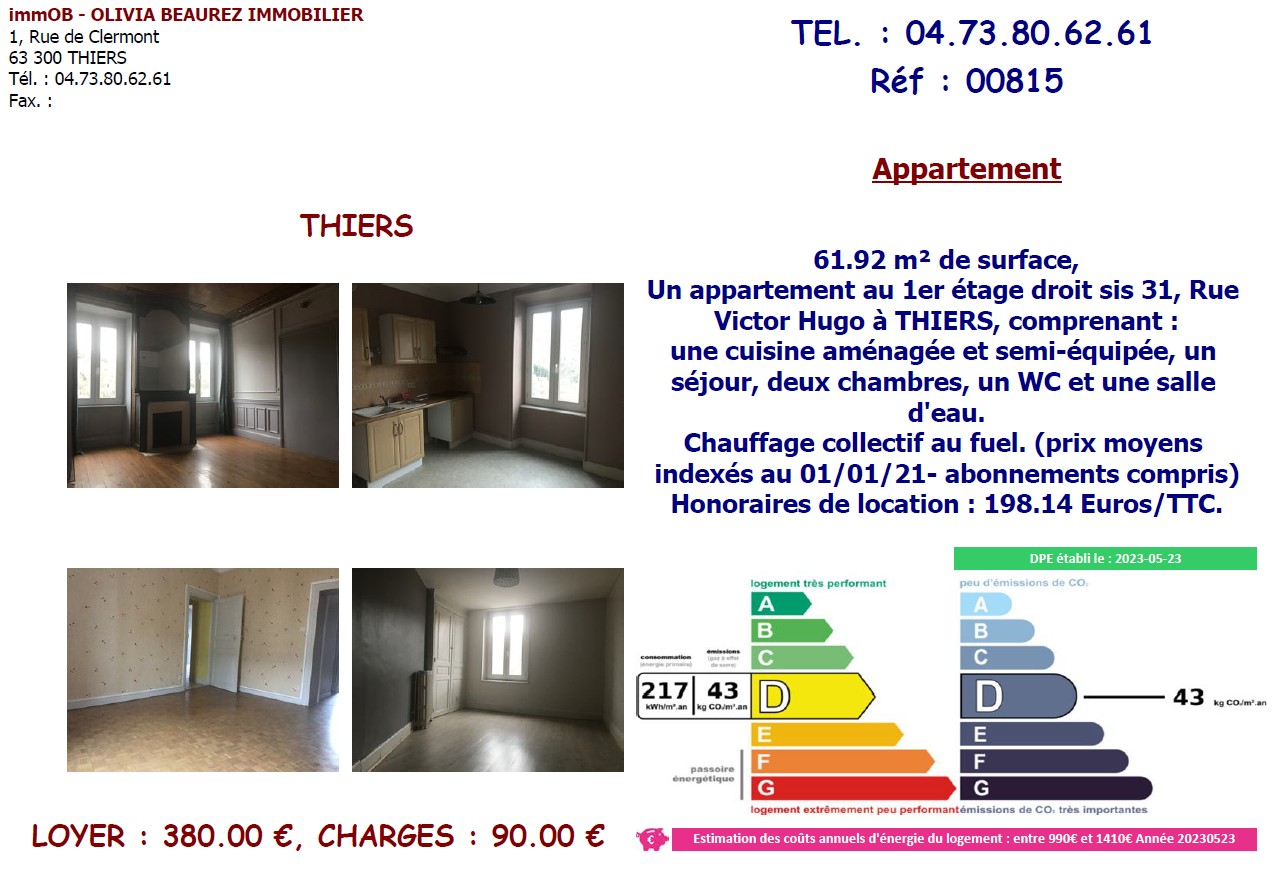 🏢 THIERS – rue Victor Hugo – APPARTEMENT – 61 m² – 470 € CC
