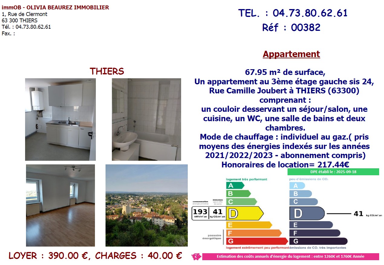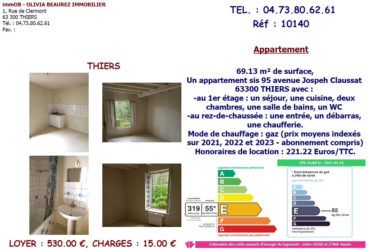 🏢 THIERS – 24 rue Camille Joubert – APPARTEMENT (Conventionné) – 70 m² – 505,00 €