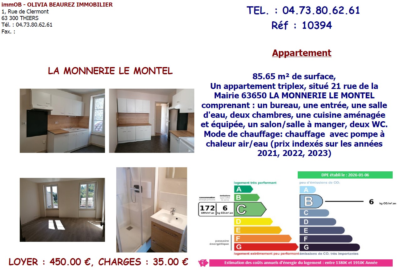 🏢 LA MONNERIE LE MONTEL – rue de la Mairie – APPARTEMENT (Triplex) – 85 m² – 485 € CC