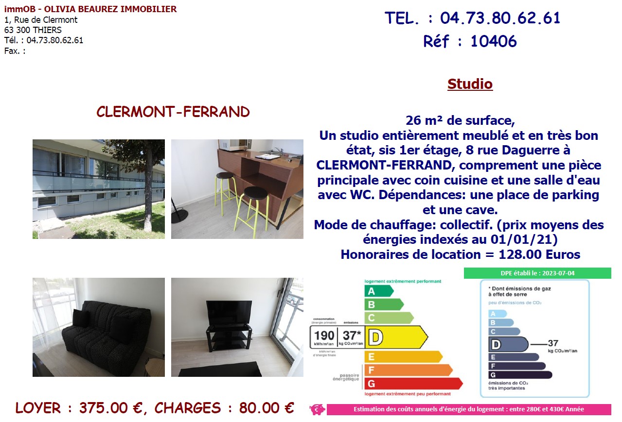 🏢 CLERMONT-FERRAND – rue Daguerre – STUDIO MEUBLÉ – 26 m² – 455 € CC