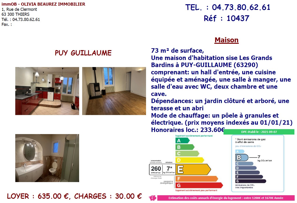 🏠PUY-GUILLAUME – lieu-dit Les Grands Bardins – MAISON – 73m² – 665€ CC